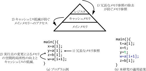 本研究では,プログラムにある命令の実行点を変更することによってメインメモリへのアクセス回数を減らす枠組みを,コンパイラのコード最適化の手法として実現した.本手法は次の2種類に分類できる.