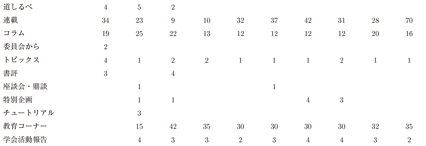 会誌を読みやすいものにするために,新しい連載を開始した.幅広い会員層に向けて漫画連載,女子部連載,人工知能学会とのコラボ企画などを行った.また現会員だけでなく,ジュニア会員増加のための試みとして,ジュニア会員向け連載「集まれ!ジュニア会員!!」,「先生,質問です!」を開始した.表2.7.3に,会誌連載タイトル一覧(2010~2019)を示す.
