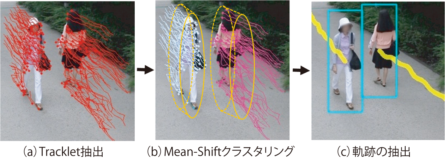 図3に開発した人流計測技術の処理概要を示す.本方式の処理は3つのステップからなる.始めに画像中の動きのある部分からTrackletを抽出する.次に抽出されたTrackletをMean-Shiftクラスタリングを用いて人物ごとに分離する.最後に,分離されたTrackletを人物ごとに集計することで,各人物の移動軌跡を計算する.得られた移動軌跡からは人物の位置や移動方向,速度といったさまざまな情報を抽出することが可能である.