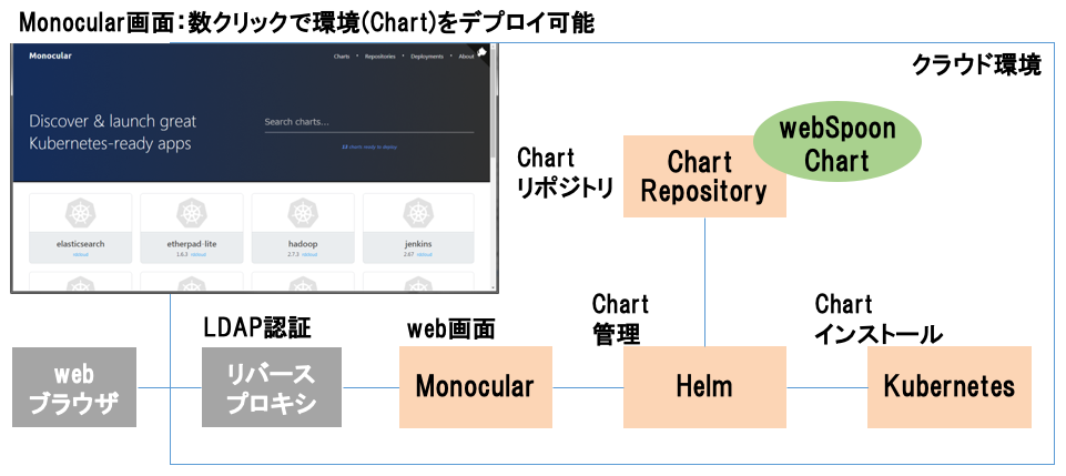 ここで,図5に示したwebSpoonを迅速にデプロイするためのクラウド環境は,図6に示すように,Dockerコンテナ管理プラットフォームのKubernetes[16],KubernetesのパッケージマネージャであるHelm[21],HelmのWeb画面を提供するMonocular[22]から構成される.Kubernetesにデプロイされる各アプリケーションはChartと呼ばれ,Dockerイメージ名やインスタンス数等を記載した各種設定ファイルの集合となっている.実践プロセスでは,webSpoon用のHelm Chartを開発することで,Monocular画面にwebSpoon Helm Chartが表示されるようになり,数クリックで環境を構築することを可能にした.