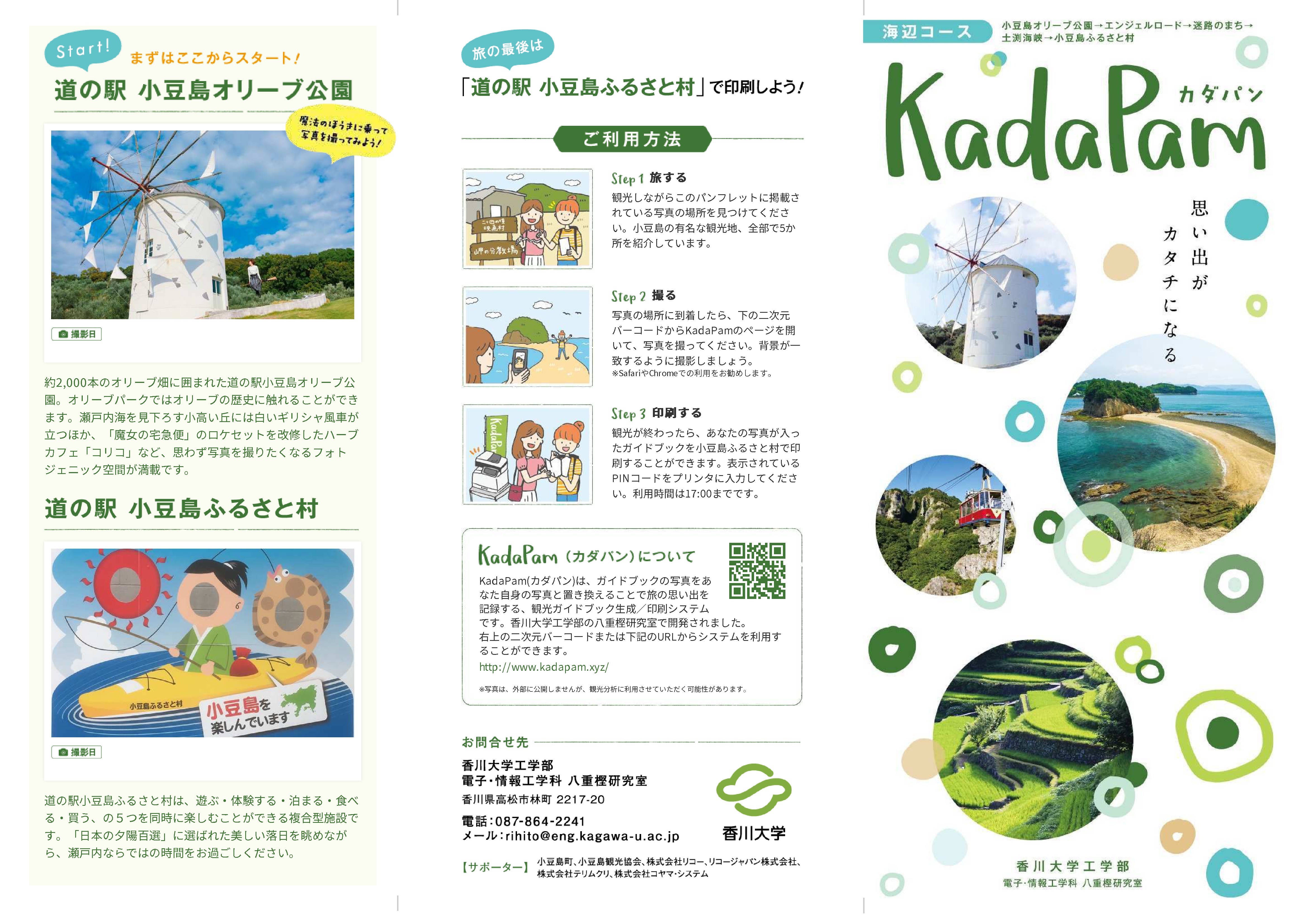 小豆島で実施された実証実験では,3種類の観光ガイドブック 岬コース(小豆島道の駅オリーブ公園,醤の郷,岬の分教場,二十四の瞳映画村,小豆島道の駅ふるさと村),山コース(小豆島道の駅オリーブ公園,寒霞渓,中山千枚田,銚子渓,小豆島道の駅ふるさと村),海辺コース(小豆島道の駅オリーブ公園,エンジェルロード,土淵海峡,迷路の街,小豆島道の駅ふるさと村)を作成した.図7は3種類のガイドブックの表面と裏面を示している.3種類の観光ガイドブックは,小豆島町役場および小豆島観光協会からの助言をベースに作成した.3種類のコースは,いずれも観光のスタート地点をオリーブ公園,ゴール地点をふるさと村とし,島内の主要観光地(エンジェルロード,寒霞渓,二十四の瞳映画村)を中心に,南西部,山間部,南東部のそれぞれ3カ所のエリアに分け作成された.カダパンを利用する観光者は,オリジナルの観光ガイドブックに掲載された観光地を訪問し,観光地でガイドブックに掲載された写真と同じ場所を探し,同じ構図で写真を撮影する.カダパンのガイドブックは,小豆島オリーブ公園,オリーブナビ小豆島,小豆島ふるさと村で配布された.