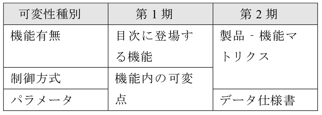 第1期活動においては,制御方式やパラメータの差異は製品機能内の可変点として記述していたが,第2期活動では,制御方式が異なる製品機能を異なる製品機能として定義したうえで,すべての製品機能を製品‐機能マトリクス上に列挙し,機能の搭載有無を表の交点に記載している.また,データの差異については個々に可変点として記述する方式から,データ仕様書に一括で記載する方式に切り替えている.すわなち,具体的なバリアント(制御仕様)を決めるために複数のフィーチャを段階的に選択する方式から,制御仕様を直接的に選択できる方式に切り替えた.