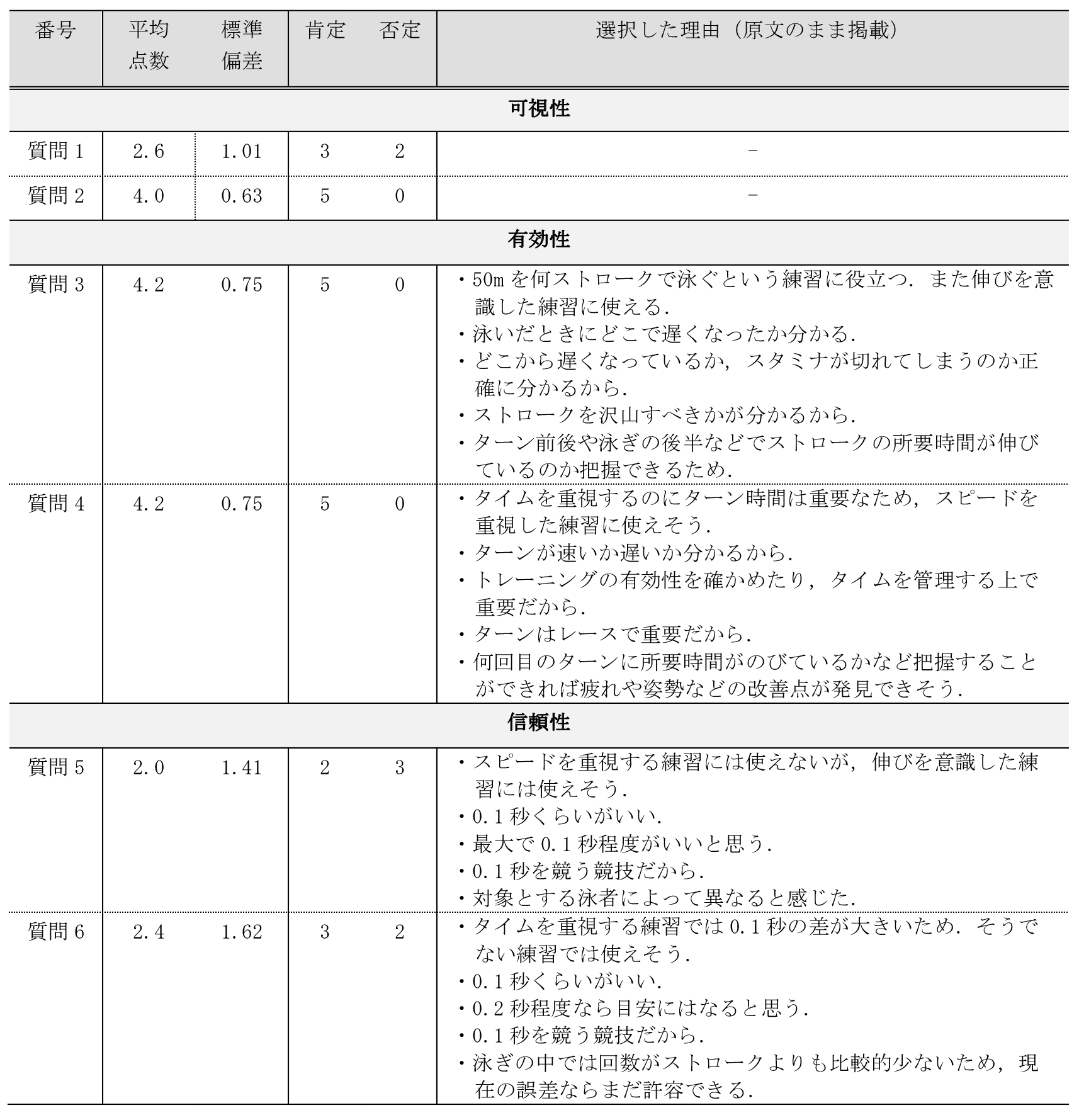 有効性については,回答を選択した理由から,質問3のストローク1回の所要時間が分かることは,スタミナの限界や遅くなるタイミングといった弱点を知る場面や回数を管理して泳ぐ練習といった場面での活用が期待されていることが見て取れた.また,質問4のターン1回の所要時間が分かることは,1ターン試技のタイム管理やトレーニング効果の表れ具合の指標として活用できそうといった理由であることが確認できた.これらの結果は,本システムが初級者・中級者の選手が自ら手軽に細かな泳動作を練習中や練習後に評価できる環境を提供できる可能性を示唆している.