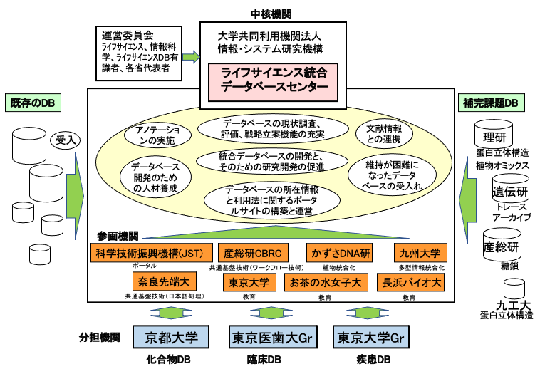 先に述べたように,内閣府の動きに呼応する形で,2005年に文科省ライフサイエンス委員会の下にデータベース整備戦略作業部会が作られ,その報告[8]を受けて,2006年後半より統合プロジェクトが立ち上がった.このプロジェクトは2006年9月から2011年3月までの4年半の時限的プロジェクトとしてスタートした.正確には2006年は半年間の試行的プロジェクトとして,2007年4月から4年間の本格プロジェクトとして実施された.そして,2007年4月には,このプロジェクトの推進センタとしてROISにライフサイエンス統合データベースセンターDBCLSが設立された.
