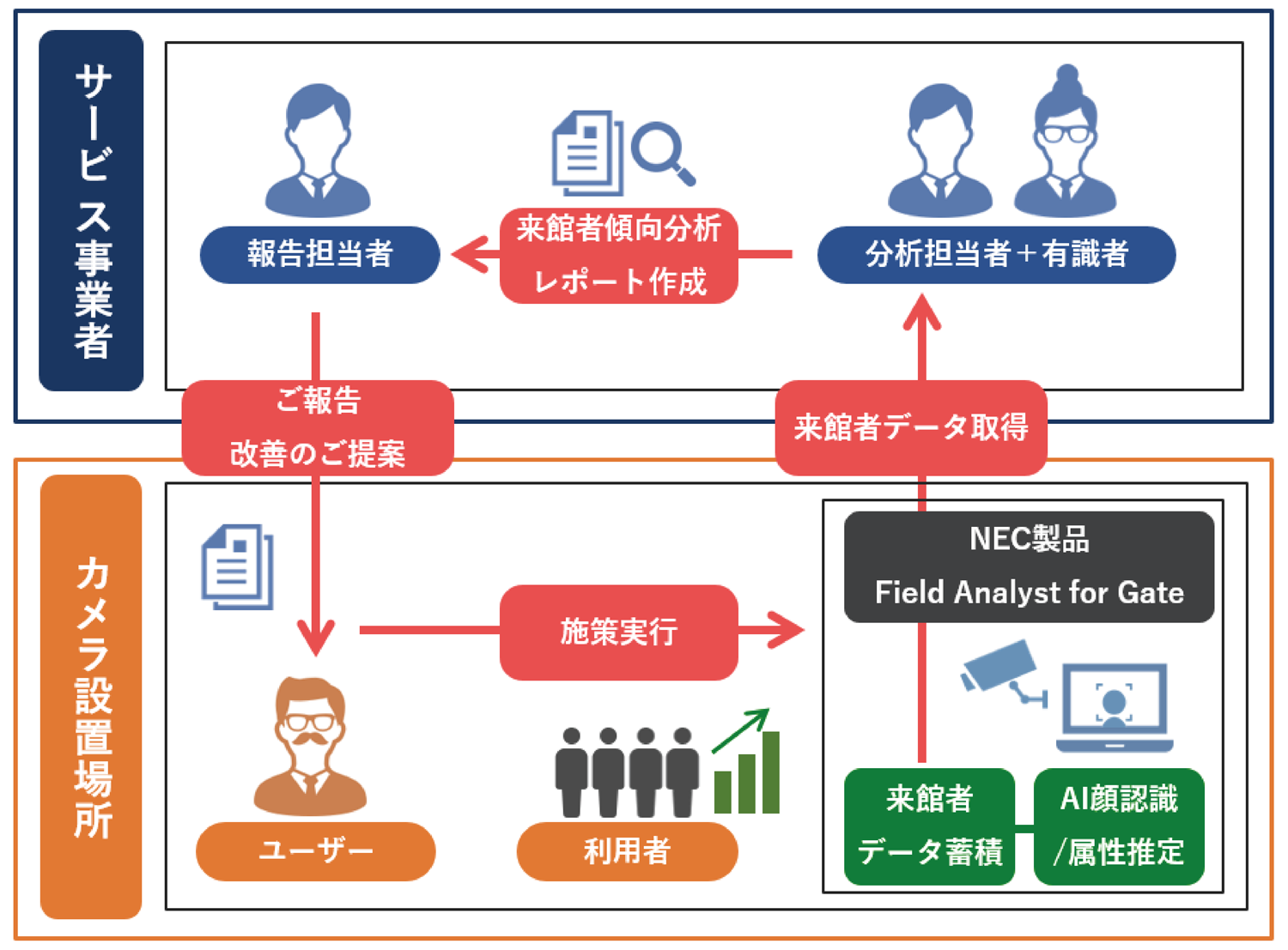 前回のビジネスPoCから1年経った2019年4月に,NECから「FieldAnalyst for Gate」の機能をクラウド化したサービス「NeoFace Cloud Type F(属性推定型)」について情報提供があった.まさに前回取り組みの際に挙げた課題解決に直結する吉報であり,NECとBCCで新事業を定義し,必要なサービスの共創を合意することで,取り組みが再び加速した.