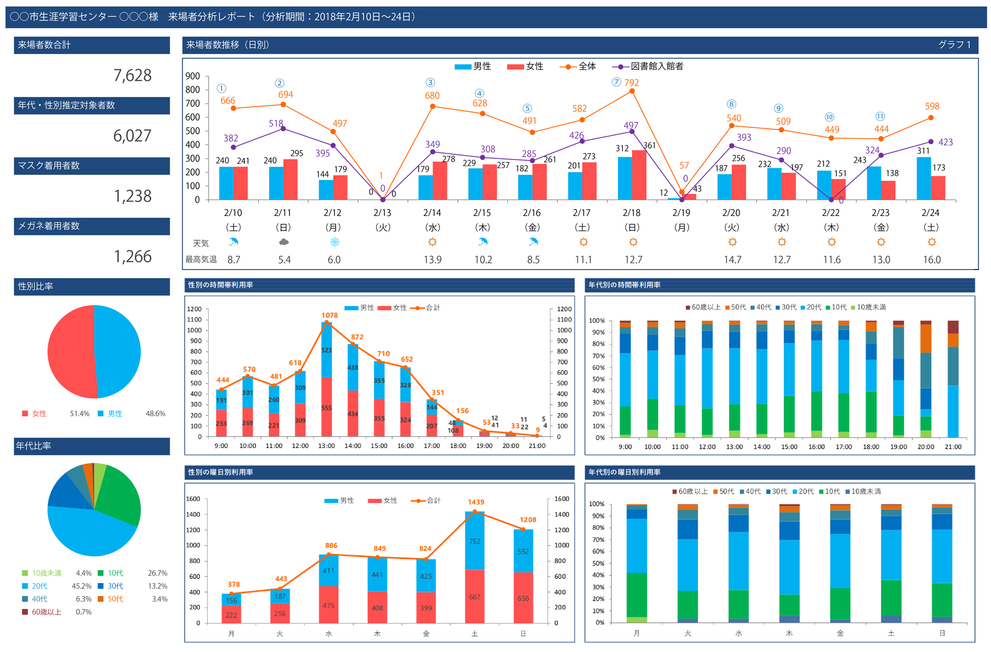 この仕組みを公共図書館に導入することで,現状では記録や可視化が困難な“来館者数”を実態として把握することができる.そして,弊社の業務担当者が来館者データを分析し,改善に向けたご提案(コンサルティング)をレポートとして提供することで,ヒアリングを行った多くのお客様の課題解決に向けた支援が可能となると考えた.