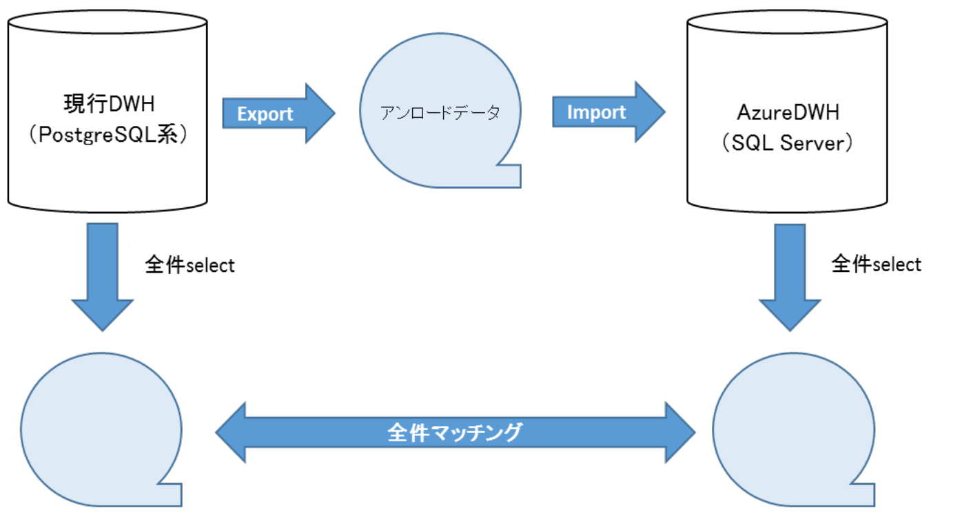 現行のDWHシステムとAzureDWHで製品は異なるが,RDBMSであるため通常のデータベース移行と同様に,データ移行はExport→Importで実施した.移行後はまったく同じデータが移行できており,どちらのDWHでも同じ結果が得られることを確認するために全データの一致確認を実施した.DWHシステムで保有するデータが約1TB,10億レコードと非常に多いため,確認作業に多くの時間を費やした.データ移行・比較方式を図10に示す.