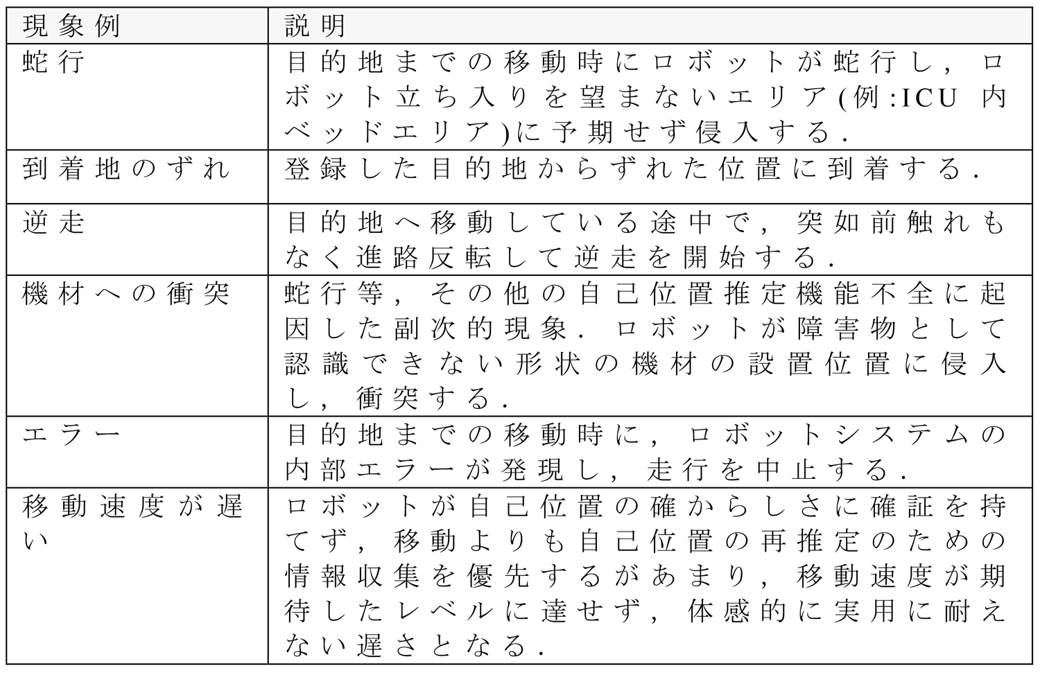 自己位置推定は,temiを含む自律移動式ロボットが自動走行するための根幹をなす機構・機能の1つである.一方,設置環境や周辺状況によっては,自己位置推定が十分に機能せず,結果として病院職員が予期できないような動きをtemiが取ることがある(表3).これらを回避し,業務内でtemiを安定的に活用するためには,自己位置推定機能が常時機能するような運用技術の確立が重要となる.