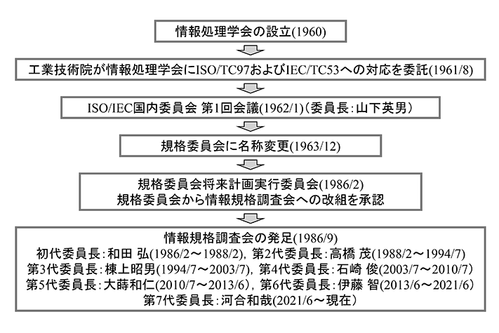 河合:はい.私も最近知ったのですけれども,学会の設立の翌年から情報規格調査会の活動が始まっています.本会が1960年に設立されて,規格に関する委員会は,1961年に設立され,実際に活動を開始したのが1962年の始めのようで,学会の中では,歴史が非常に長いですね(図1).