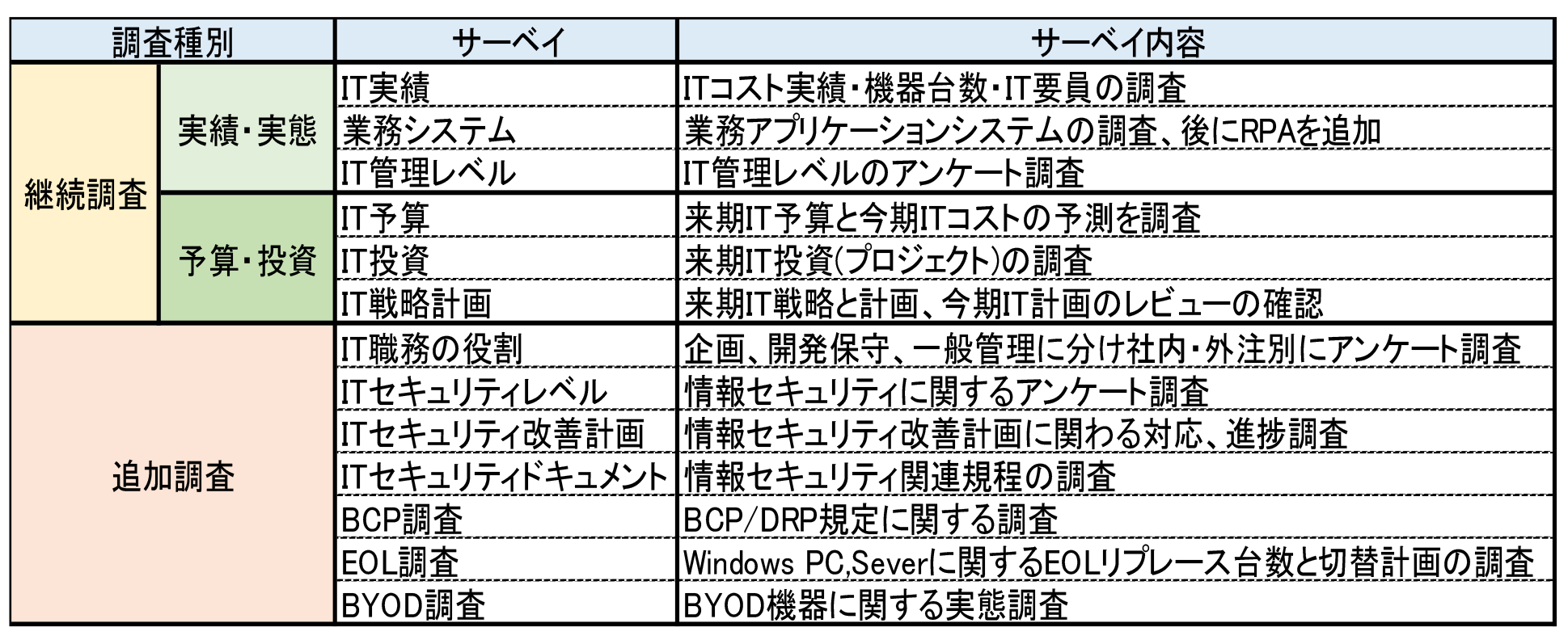 ITサーベイを3年間実施し,運用が軌道に乗り追加調査としてセキュリティ・リスク関連とIT要員のコア業務とノンコア業務の調査を実施した.