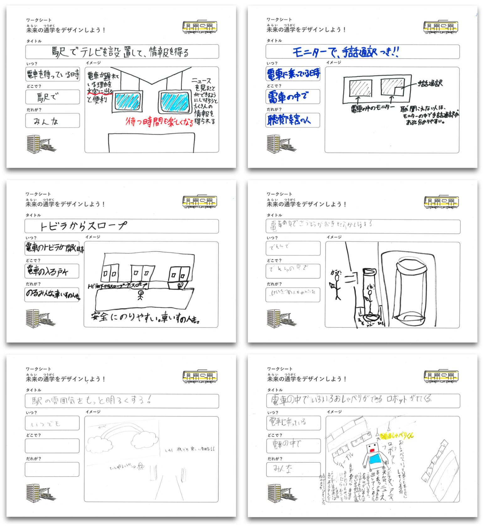ワークシートを通して,ろう学校に通う生徒1人ひとりから,通学をより安心安全に,もしくは楽しくなるようなアイディアを数多く得られた.具体的には,