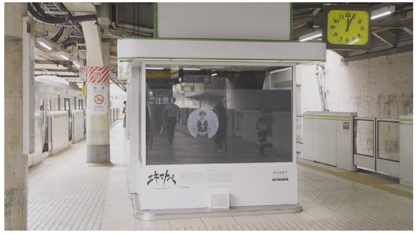 単一の無指向性マイクによって集音された音声をAI分析し,各番線アナウンスの文字・手話動画化,および車両・ホームドア・スピーカーから鳴る音のオノマトペ化を行う.また,駅員のマイクから取得した駅アナウンスをリアルタイムに文字に変換するほか,文章の意味に合わせてフォントを自動的に変化させる(図16).LEDモニターのサイズは縦1m×横2mであった.