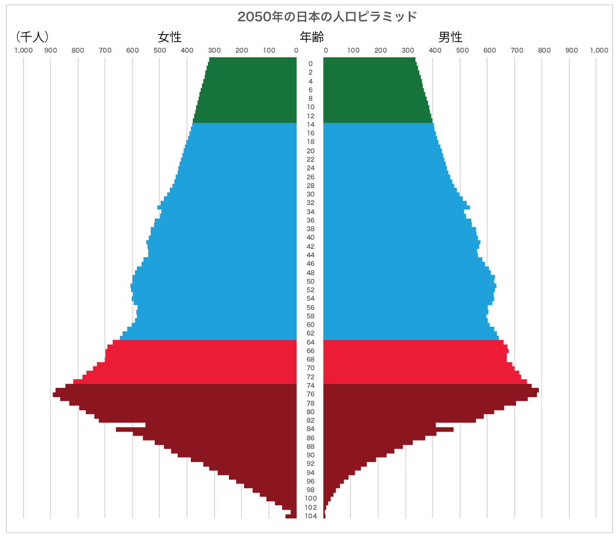 国立社会保障・人口問題研究所の将来推計人口では2035年から我が国は毎年100万人の人口減少が始まることに起因する社会の担い手の欠乏がある.人口減少の中でさらなる高齢化を迎えていく日本においては,社会を支えていく人材の枯渇は非常に深刻な問題となってくる.特に900近い消滅可能性都市と呼ばれる地域では,若年層だけでは社会を支えきれなくなる姿が目に見えている[8].図2は総務省統計局により推計された2050年の日本の人口ピラミッドである.安定したピラミッド型に見えるかもしれないが,これはよく見る人口ピラミッドと異なり若年層を上に,高齢者層を下に表示したものである.現在の社会構造のままだと,ほぼ1人の現役世代が1人の高齢者を支えないといけなくなる未来であるが,このように逆転させてみると,アクティブシニアが現役世代をバックアップできる社会構造を構築することで安定した未来を築ける可能性が見えてくる.