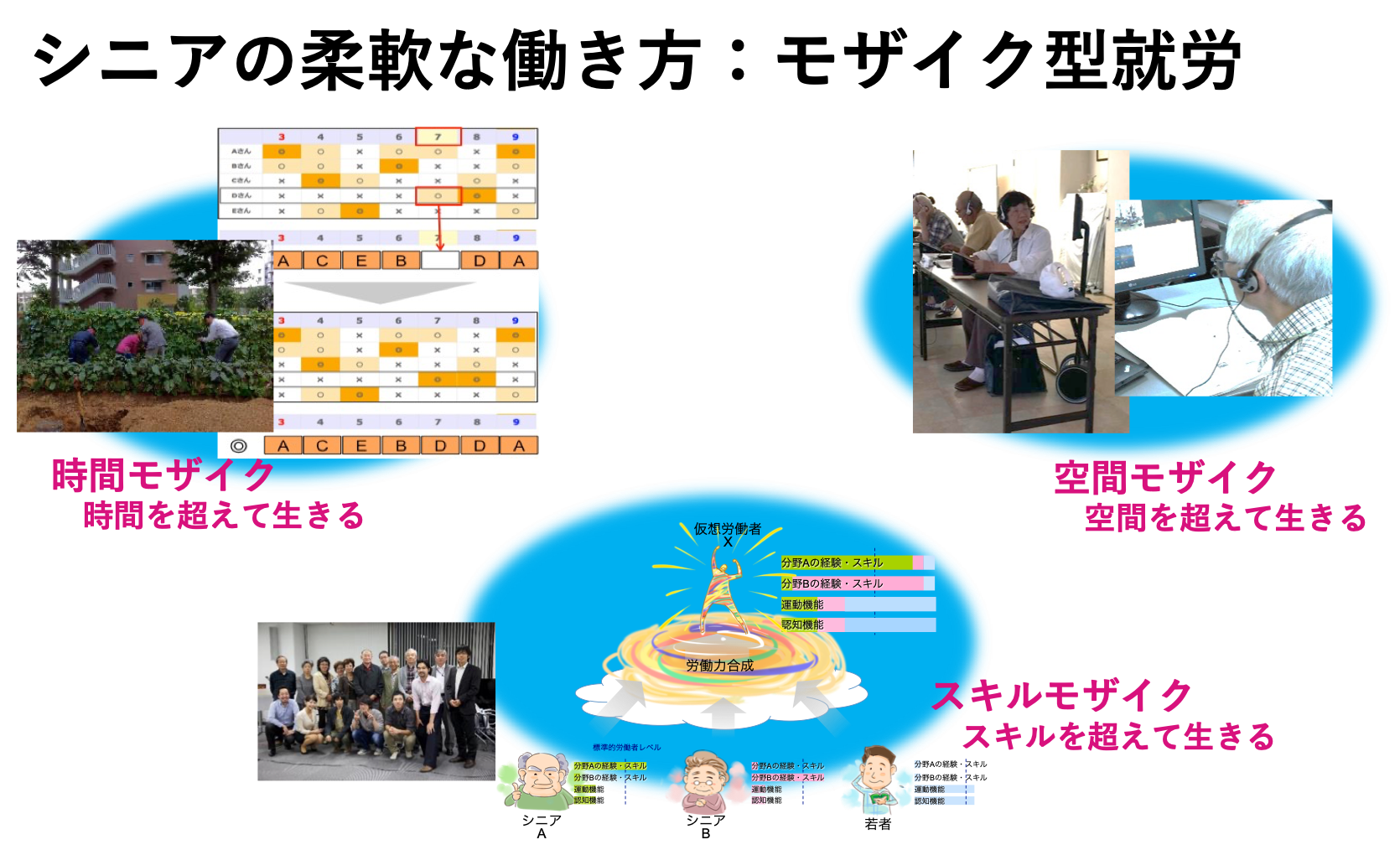 採用側の視点から高齢者を労働資源として捉えたときに,「いつ,どこで,何ができる人が,どれくらいいるのか」が把握しづらい労働資源だと捉えることができる.ICTを活用して地域の高齢者人材のアベイラビリティをデータとしてクラウド上に蓄積することで,「いつ,どこで,何ができる人が,どれくらいほしい」という条件に合わせて見出すことができる可能性が出てくる.そして1人の高齢者がフルタイムで参加するのではなく,複数人で1人分の仕事をこなす形で参加することを考える.これをモザイク型就労と呼んでいる[9].