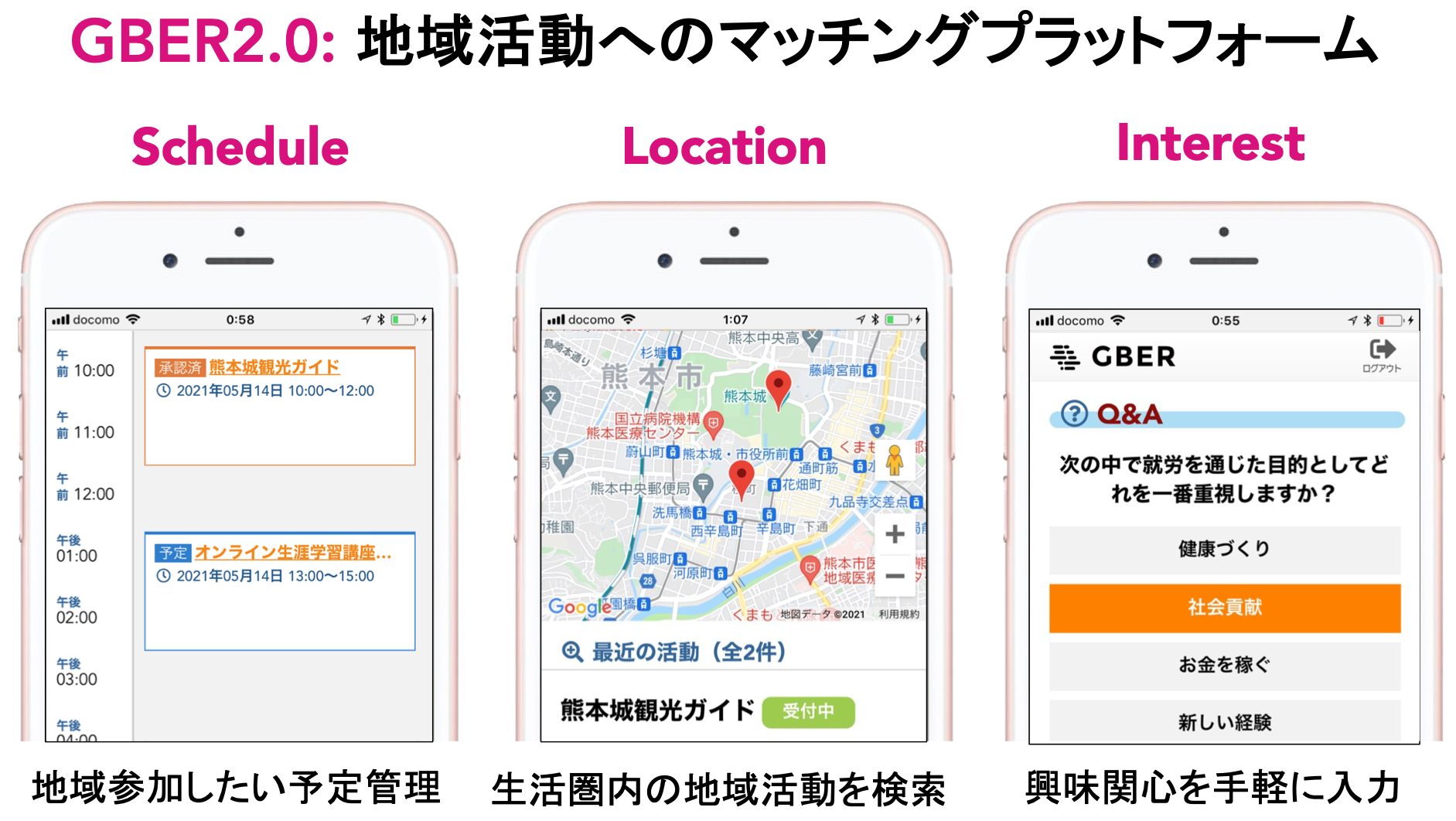 このモザイク型就労の実現へ向けた研究開発の中で,1つのまとまったサービスとしてできた成果が,地域の高齢者の社会参加と就労を促進するプラットフォーム:GBER(Gathering Brisk Elderly in the Region)である[10].社会参加する高齢者個人の目線で地域の活動との接点を紡いでいくことを目指したプラットフォームである.図4にGBERの基本的な3つの機能を示す.1つ目はカレンダー機能である.カレンダー機能を使うことで,スケジュールの空き状況に合わせた地域活動(社会参加につながる生涯学習やイベント,ボランティア,そして就労を総称して本稿では地域活動と呼ぶことにする.)とのマッチングを可能にする.2つ目はマップ機能である.生活圏内の地域活動を探すことに役立てられる.そして3つ目はQ&A機能である.多くの高齢者はインターネット上に自分の情報を発信することに慣れていなかったり面倒に感じていたりする.そこでシステムの方から簡単に答えられる質問として,たとえばある種の地域活動に興味があるかないかを投げかけるようにすると,時間のあるときによく答えてもらうことができるようになった.このような形で,1人ひとりの高齢者がどのような社会とのかかわり方を望んでいるのかを把握し,地域活動を推薦することにつなげられる情報を集めることができる.