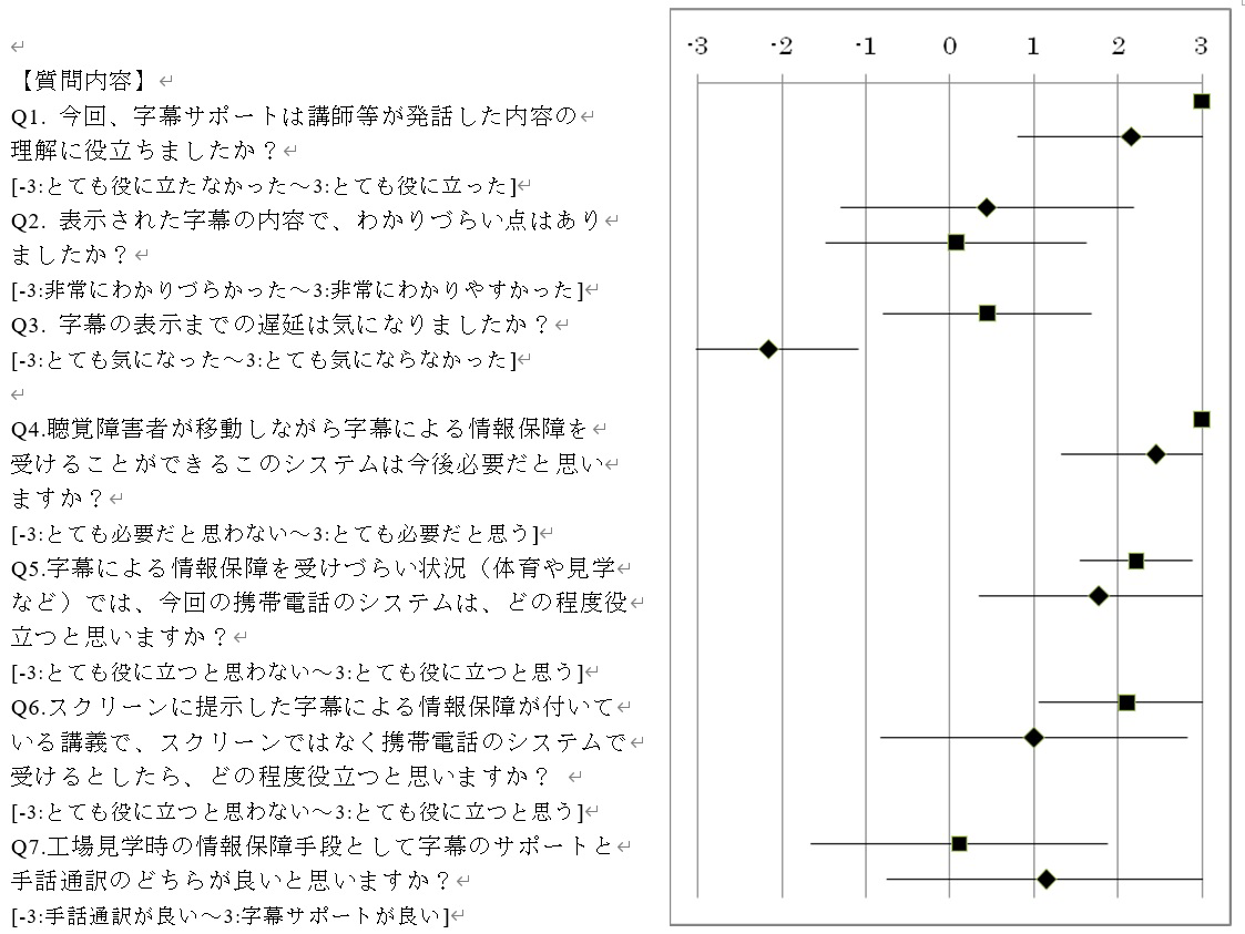 最後のQ7では,工場見学Aのグループはどちらとも言えない,工場見学Bのグループはやや字幕サポートのほうが良いという結果となり,これは説明内容の専門性や情報を受け取る側の嗜好が反映された結果ではないかと考えている.