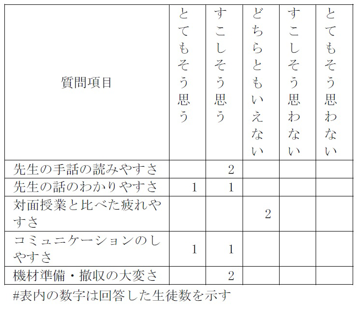 生徒2名の評価は,手話の読みやすさ,先生の話の分かりやすさ,コミュニケーションのしやすさ,の項目で,いずれも肯定的な評価であった.少人数でのやりとりなので,相互に話が伝わっているか,理解を確認しながら進めることができることと,大事な専門用語はキーワード領域に提示してメモを取らせるなどの工夫をさせたのが良かったのではないかと考えている.一方で,対面授業と比べたときの疲れやすさはどちらとも言えず,もしかすると画面での手話の読み取りで目が疲れた可能性はある.また,この授業の教室側での機材準備は教諭の指導のもと,生徒自身で行わせたので,少し大変だったようである.