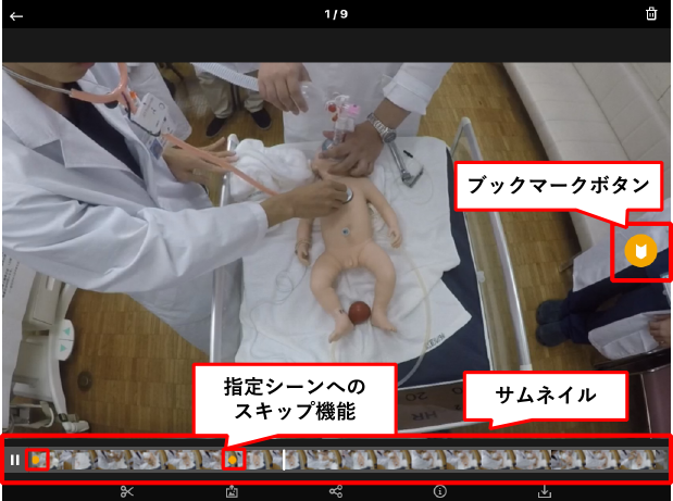 JRC蘇生ガイドライン2020では,ビデオによる振り返りを講習生が自身の問題点について第三者の目線から客観的に把握できるとして推奨している.また,従来の講習では講習生が振り返るための十分な支援策が存在しない.よって,ガイドラインの遵守および振り返りの支援のためビデオによる振り返りシステムを開発した.図8に振り返りシステムの画面を示す.本システムは,動画の撮影開始・停止をコントローラーから制御可能である.また,講習中に撮影したビデオをタブレット端末でストリーミング再生することで,即時振り返りを可能としている.また,シーンを確認可能なサムネイル機能,動画の任意の部分へのブックマーク機能,指定した場所へのスキップ機能も実装している.これらの機能により,振り返りの支援を目指した.また,この振り返りシステムは,従来の高機能シミュレータにも,組み合わせることが可能である.