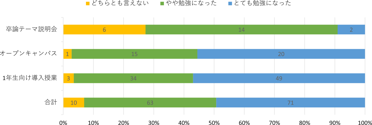 卒論テーマ説明会の際には動画のオンライン配信時に音声が配信されないトラブルが発生したため視聴できなかった学生もいた.そのため回答数も多いとは言えず,評価もあまり良くないが,オープンキャンパスや1年生向け導入授業では比較的良い評価を得ることができた.