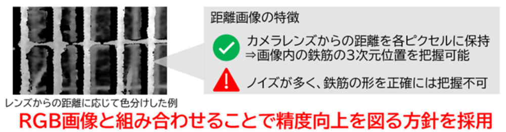画像処理アルゴリズムの概要を説明する.まず,デプスカメラの画像から鉄筋の大まかな形を抽出し,その上にデジタルカメラのRGB画像を重ね合わせ,ノイズ部分を特定する.このノイズ部分を除去する処理により実際の鉄筋に近い形状を抽出する.抽出したデータを使った計測では,誤差が最大±5mmと運用に問題ない精度になることが確認できた.本技術は特許出願中である[1](図7).