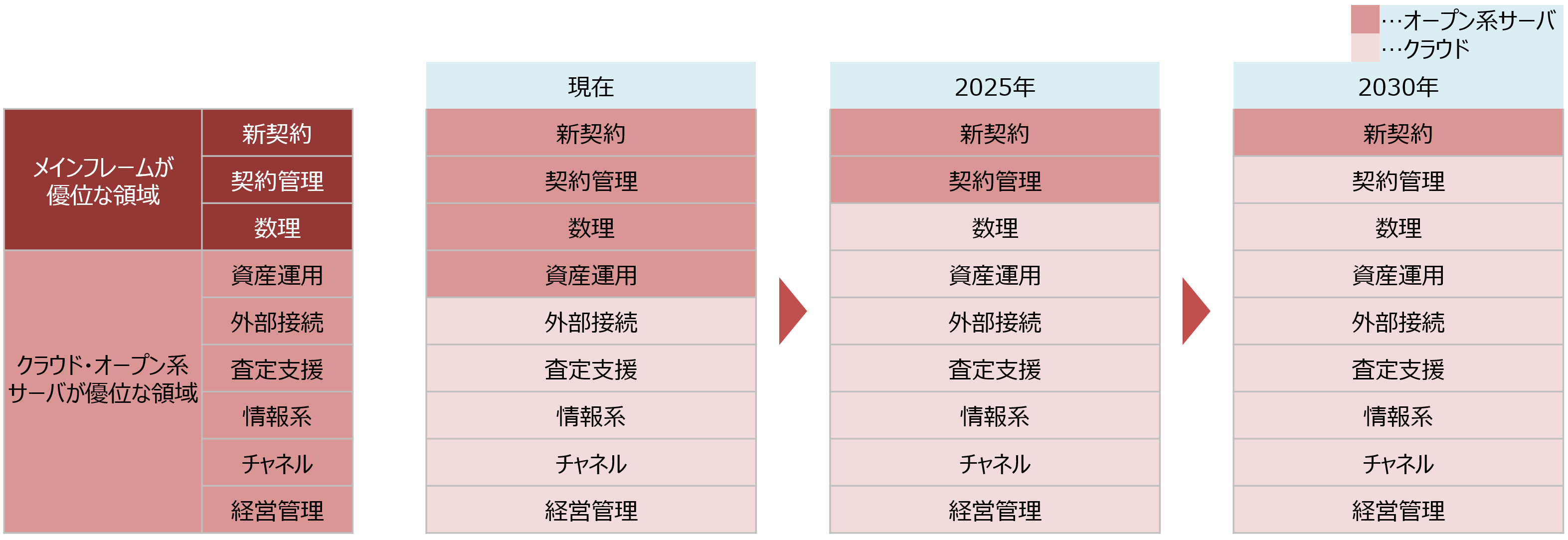 保険会社のシステム構成,各社アンケート,ベンダーインタビューを参考に,今後のあるべき姿について示す.