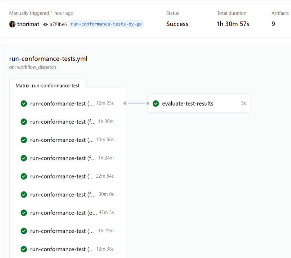 In Section 5.3, we confirmed that the nine conformance test types can be automatically executed in parallel using the conformance test execution platform with GitHub Actions. We also confirmed that the completion time of nine conformance tests was reduced by 62.4% by this test parallelization.