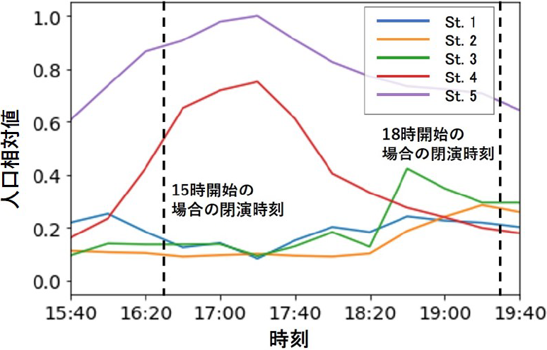 15時イベント開始のグラフに着目すると,流出速度レベルが5の場合,つまり観客の退場をあまり分散させない場合,評価関数の値は最も低くなり,混雑を軽減できることを表している.一方で,18時イベント開始のグラフでは,流出速度レベルが2のときが,評価関数の値は最小となる.つまり,15時開始の場合には流出速度を大きく,18時開始の場合には流出速度を小さくすることが望ましいことを示している.図7によると,「15時開始の終了時刻」と「18時開始の終了時刻」では後者の方がSt. 1, 2, 3の非観客の利用者が多い.なお,図1に示すとおりSt. 1, 2, 3は会場に近いため,多くの観客が利用する.そのため,非観客と需要が重なる18時開始の場合は,流出速度を制限すべきだという直感にも沿う結果を得られた.