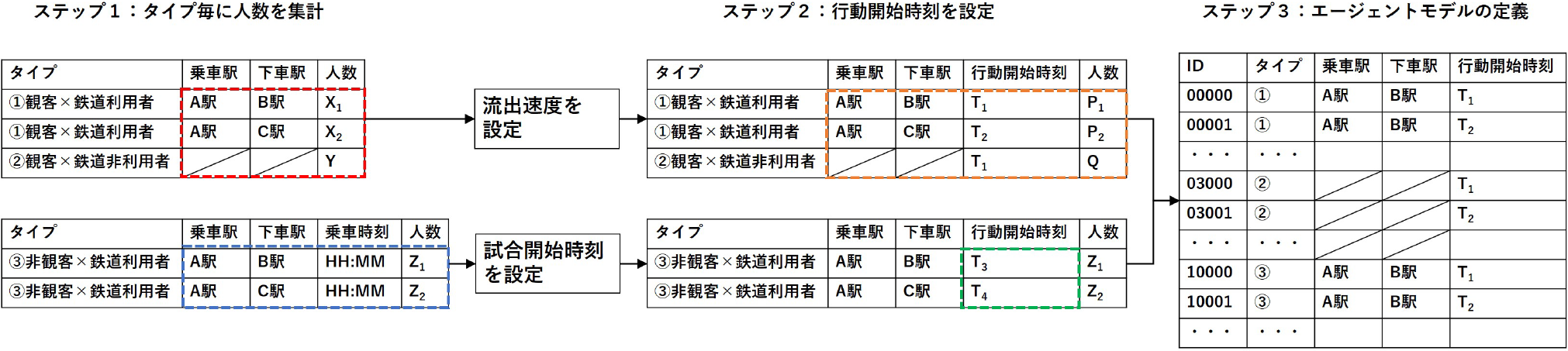 ステップ2で算出した乗車駅,下車駅,行動開始時刻を基に,各人数の分だけエージェントを生成した.観客×鉄道利用者エージェント(i)は,シミュレーション開始と同時に出現し,下車駅に到着した時点で消滅する.観客×非鉄道利用者エージェント(ii)については,定義された行動開始時刻で会場を出発し,徒歩でランダムに指定した建物に向かい,到着したタイミングで消滅する.エージェントの出現時刻はシミュレーション開始と同時である.非観客×鉄道利用者エージェント(iii)は,行動開始時刻に出現し,下車駅に到着した時点で消滅する.