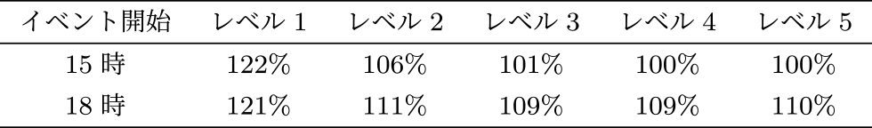 PiおよびTiの結果を表2と表3に示す.表2と表3の値は,会場に最も近い駅であるSt. 2における人口ピーク値P2および混雑解消時間T2について,15時イベント開始,流出速度レベル5を100%としたときの比率である.