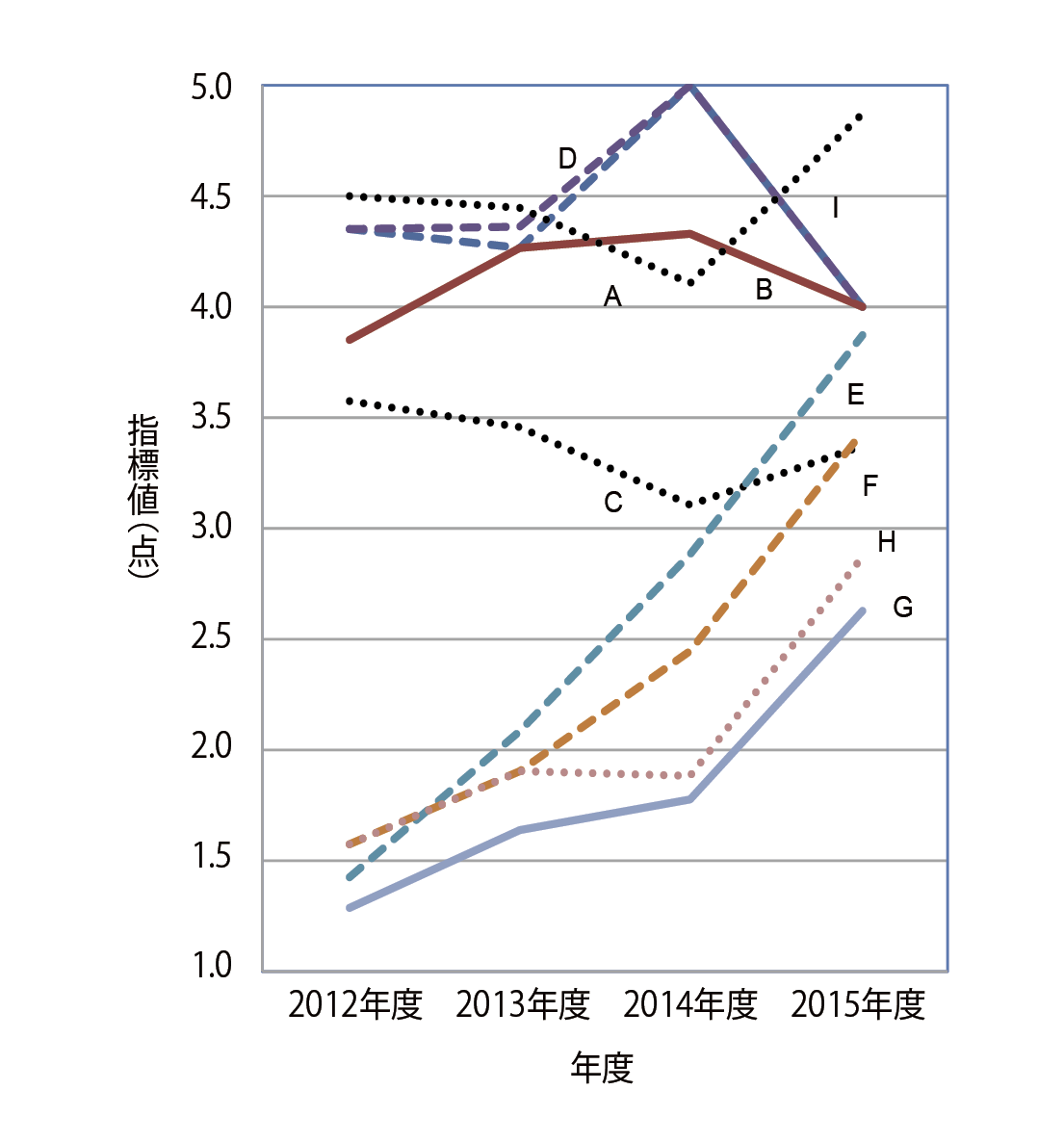 各項目の指標値の年度推移を図6に示す.特筆すべきはE/F/G/Hの値の変化である.取り組み当初はA/B/C/D/Iの値と差があったが,2015年度には項目によっては同じレベルに達している.特に項目EとFの上昇が顕著であるが,これは前節の弱点の強化策が奏功したものと考えられる.