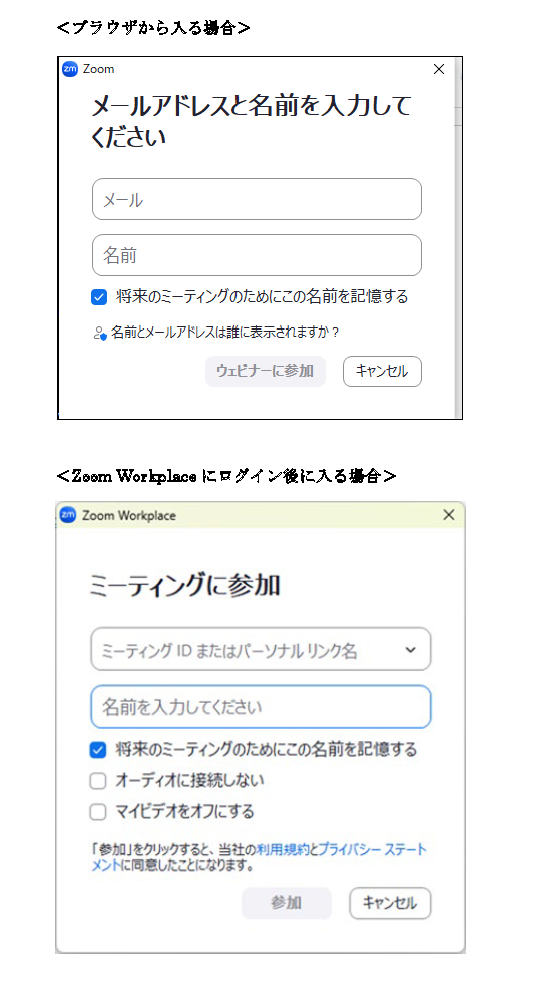 Zoomにお入りいただく際にはメールアドレスまたはミーティングIDとお名前を入力してください。